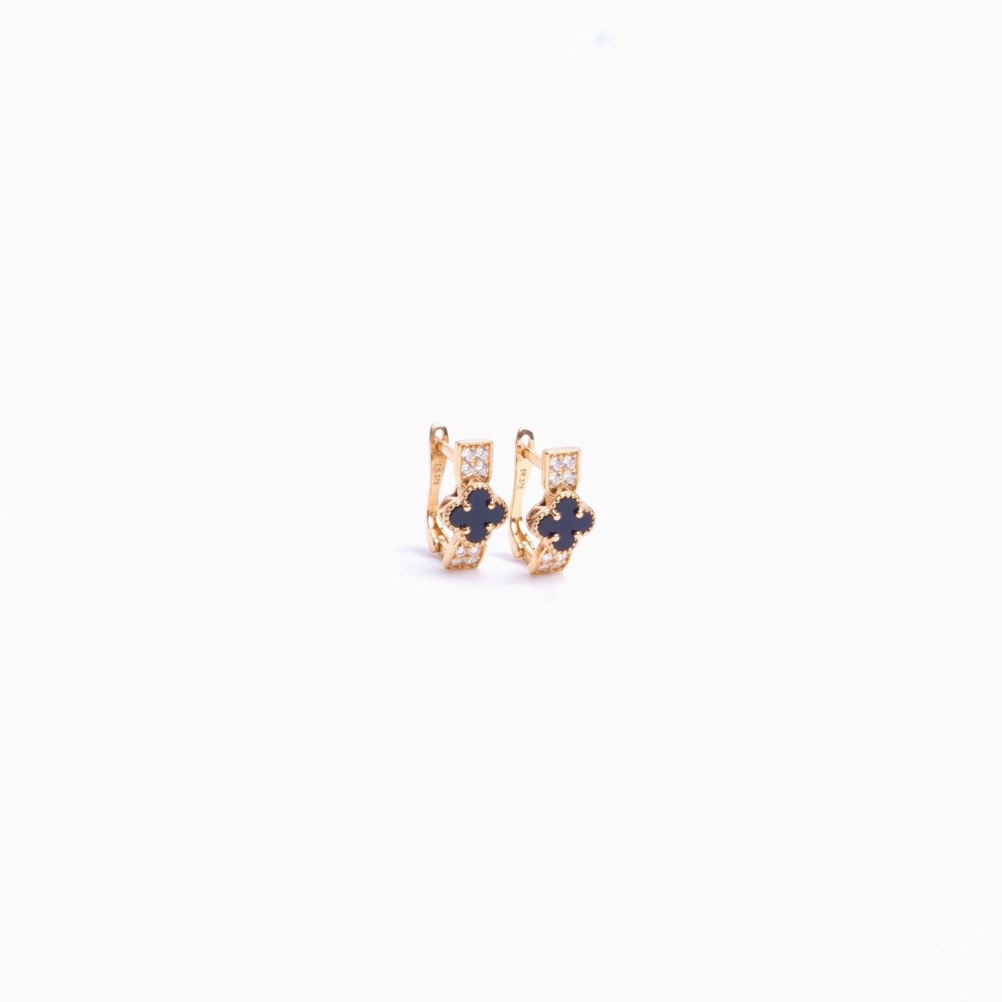 Elegant gold earrings with black enamel clover motifs, highlighted by sparkling diamond accents.